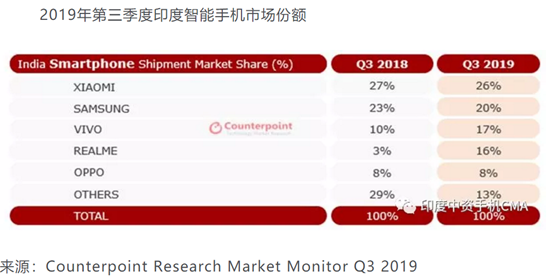 印度智能手機(jī)市場對于合力泰是一個全新的增量市場。2017年中國市場智能機(jī)滲透率約為96%,印度智能機(jī)市場僅有42%,年出貨量1億左右,由于整體手機(jī)出貨量以及智能機(jī)滲透率的差距,導(dǎo)致印度智能機(jī)目前出貨量僅為中國市場的四分之一,未來隨著基礎(chǔ)設(shè)施建設(shè)、軟件應(yīng)用滲透完善,成長空間十分廣闊。盡管2019年各行業(yè)經(jīng)濟(jì)放緩,但印度智能手機(jī)市場第三季度依舊實現(xiàn)兩位數(shù)增長,出貨量創(chuàng)新高,達(dá)到4900萬部,增長均來自智能手機(jī)主要品牌商如小米、三星、OPPO(REALME屬OPPO旗下品牌)、VIVO等,詳情見下表: